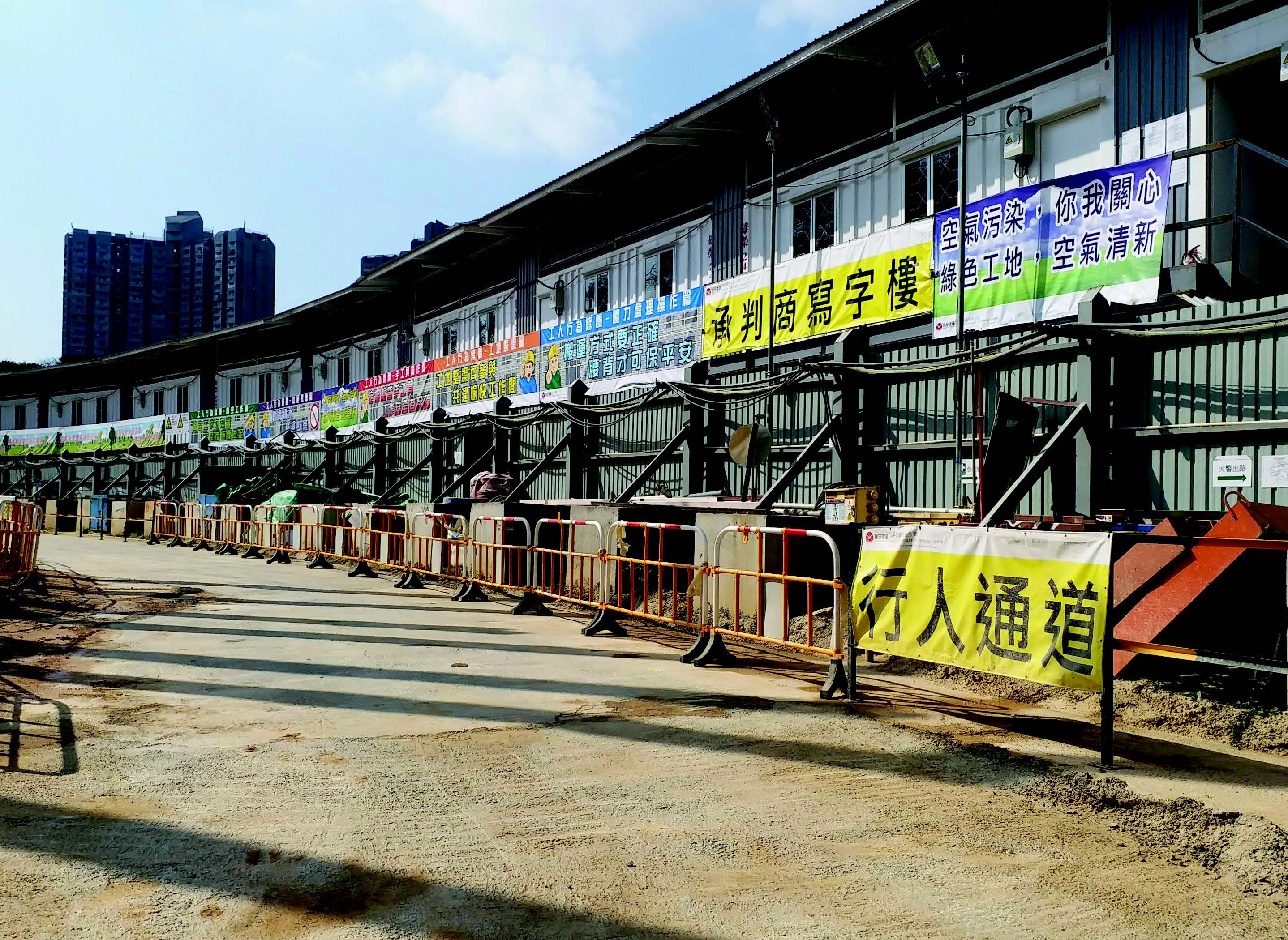 A 6 metres high and around 90 metres long metal “container baffle” had been erected at the northern side of the site. It not only acts as sub-contractors’ office, but also acts as fixed noise barrier to reduce nuisance to the villagers. After testing with a sound level meter, this setup can reduce around 10dB during piling installation.