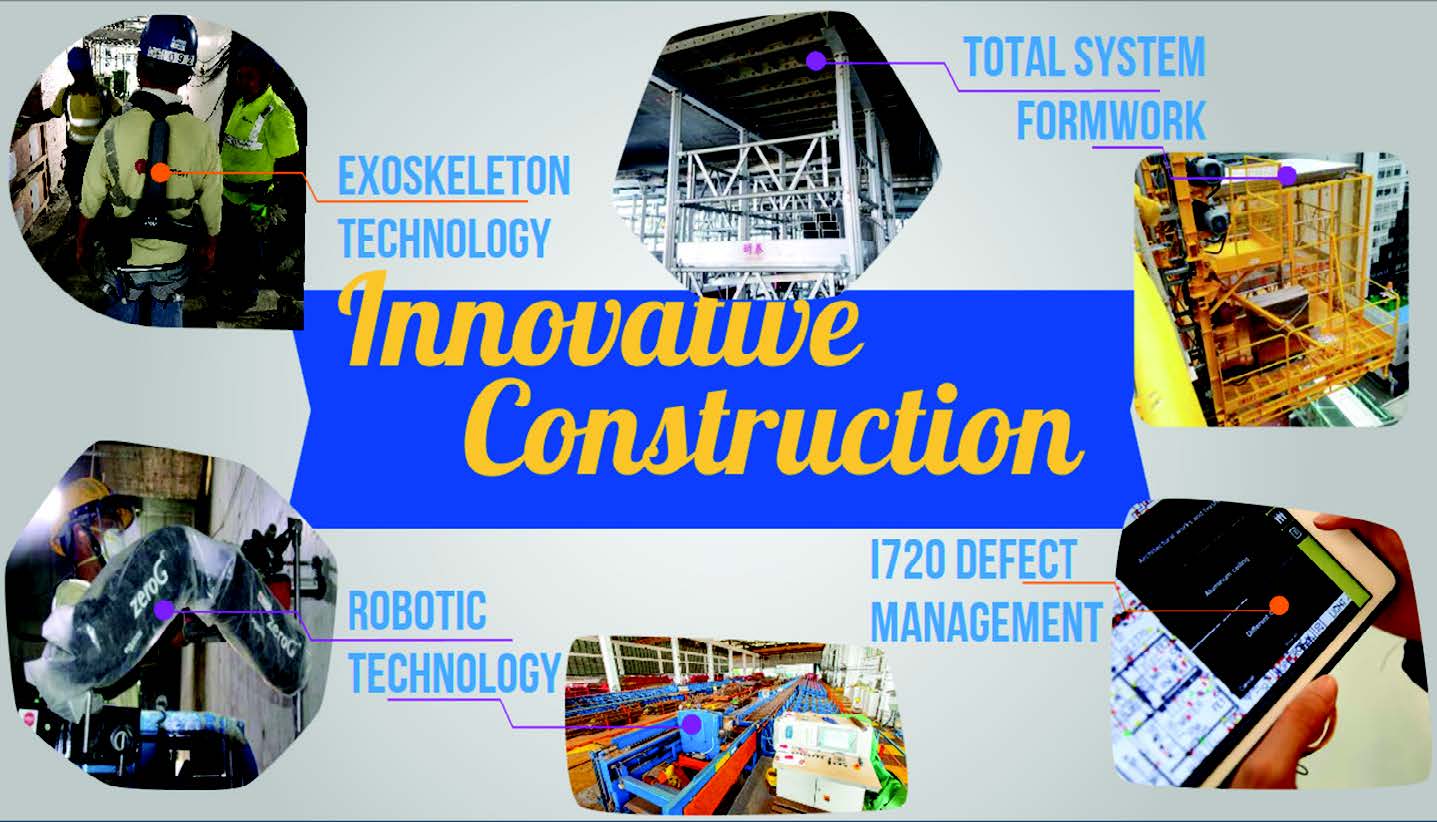 Innovative mechanical device - Zero Gravity (ZeroG) Arm is being applied to reduce stress and improve the productivity of our workers during prolonged drilling and fixing works at wall and ceiling. Total system formwork was applied for concrete casting to achieve 4 days cycle of concreting. We adopted the tableorm to reduce the amount of timber formwork erection on site.