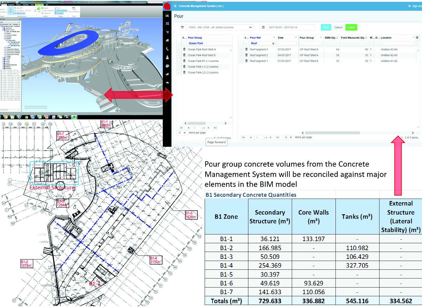 The project team extracts concrete volumes from the BIM model to ensure accuracy of concrete orders for the complex, irregular shapes on the project. The in-house, paperless Concrete Management System is then used for ordering and finally the ordered and BIM concrete volumes are reconciled. This process reduces potential wastage from over-ordering.