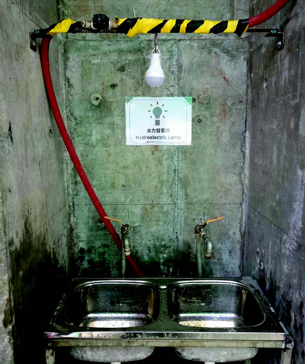 Considering the large water utilization of site operation, hydroelectric generators were installed at water supply system. The electricity generated by hydropower was used for the light signal of refuse chute. It is high applicability and easy-to install, approximate 5kg CO2e of carbon emission to be reduced annually