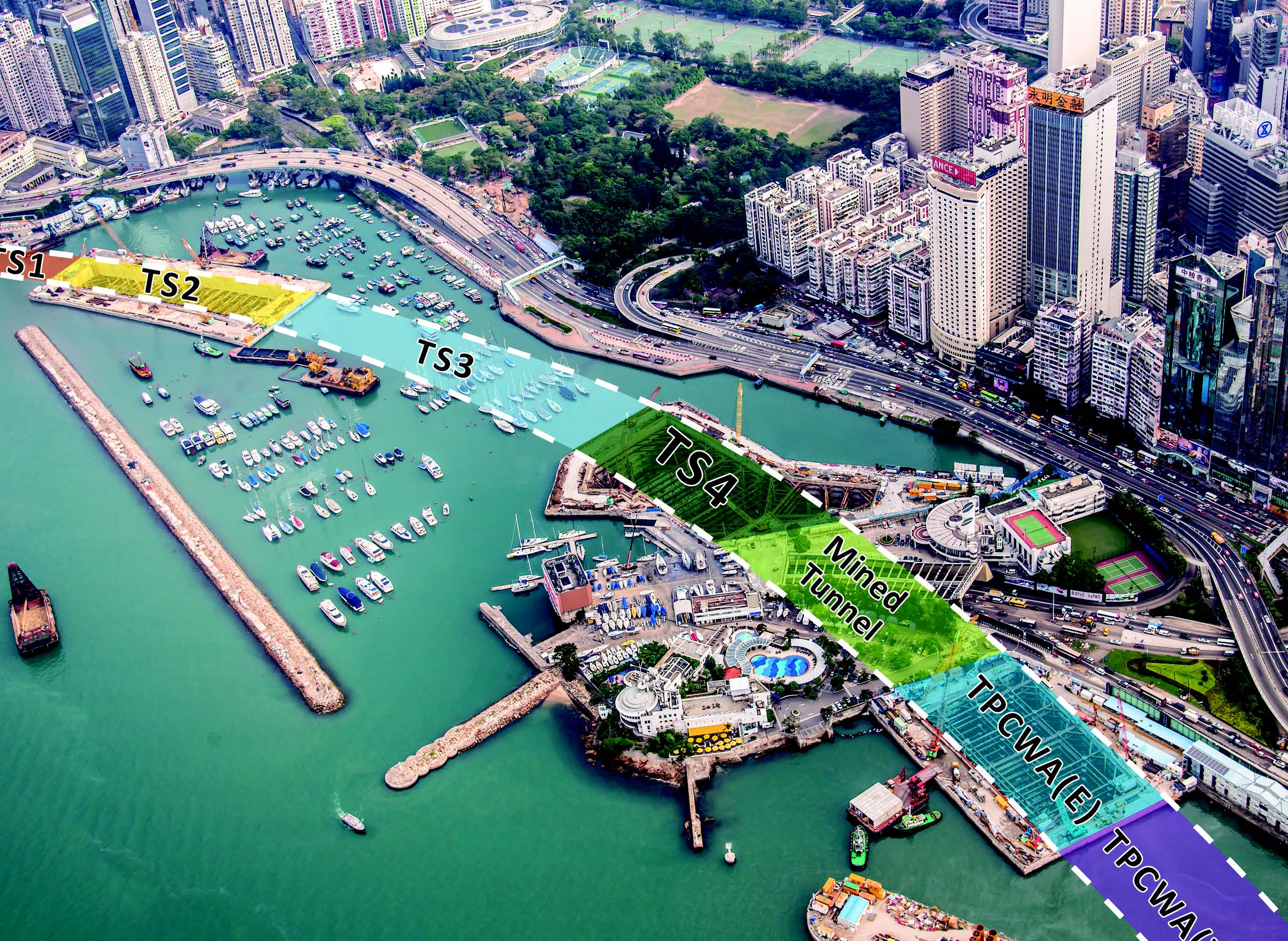 Cut-and-cover tunnel at Causeway Bay Typhoon Shelter and ex-Public Cargo Working Area underwent a 6-Phase temporary reclamation construction process. Such arrangement minimised embayment effect within the area, impact to environment and ecology and disruption to the daily activities of vessel owners. Beneficial reuse of temporary steelworks, concrete seawall blocks and other construction and demolition materials were also achieved.