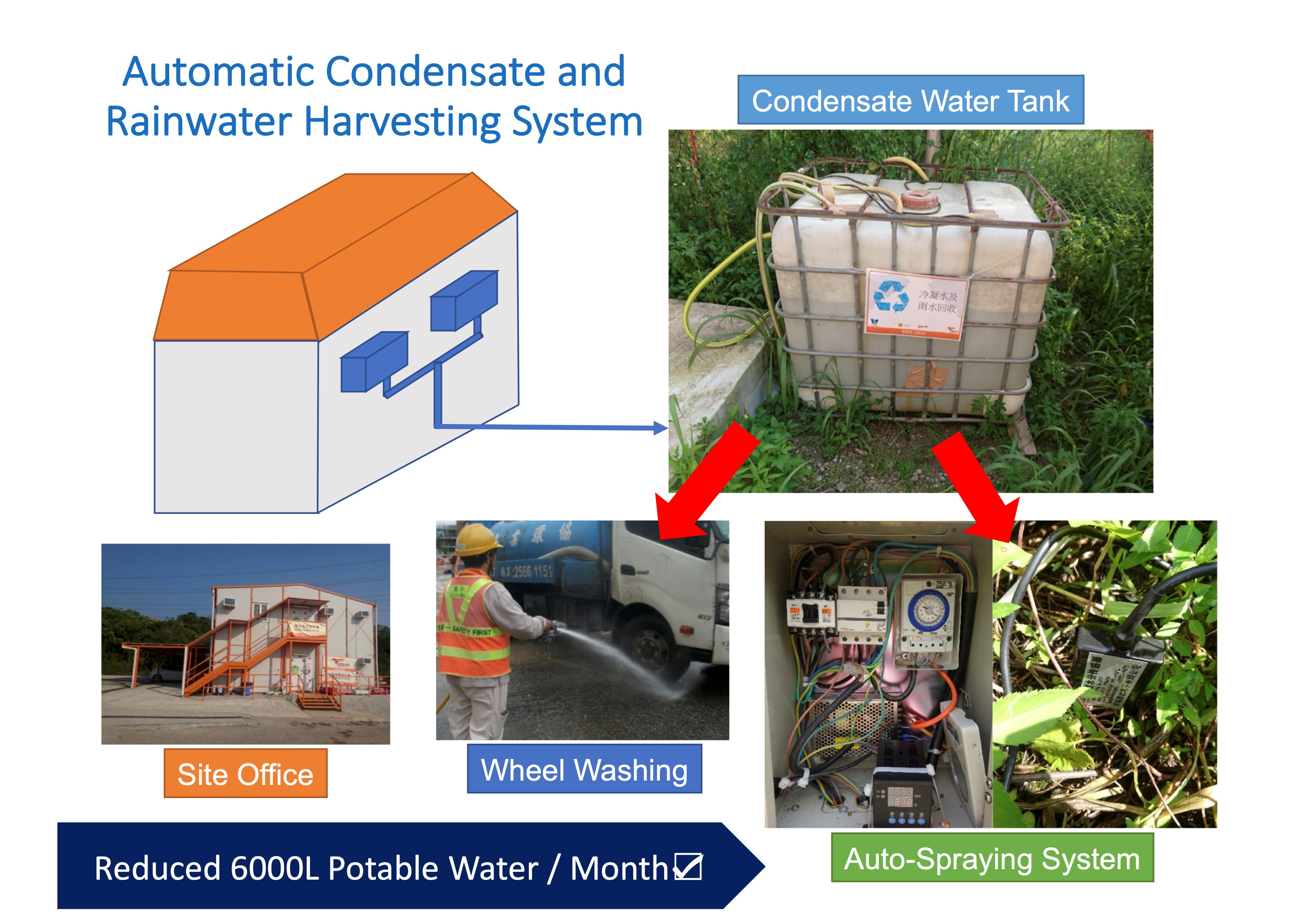 Collecting discharge water from air conditioners and rainwater at site office for wheel washing and spraying, to save over 6,000 litres of potable water every month.