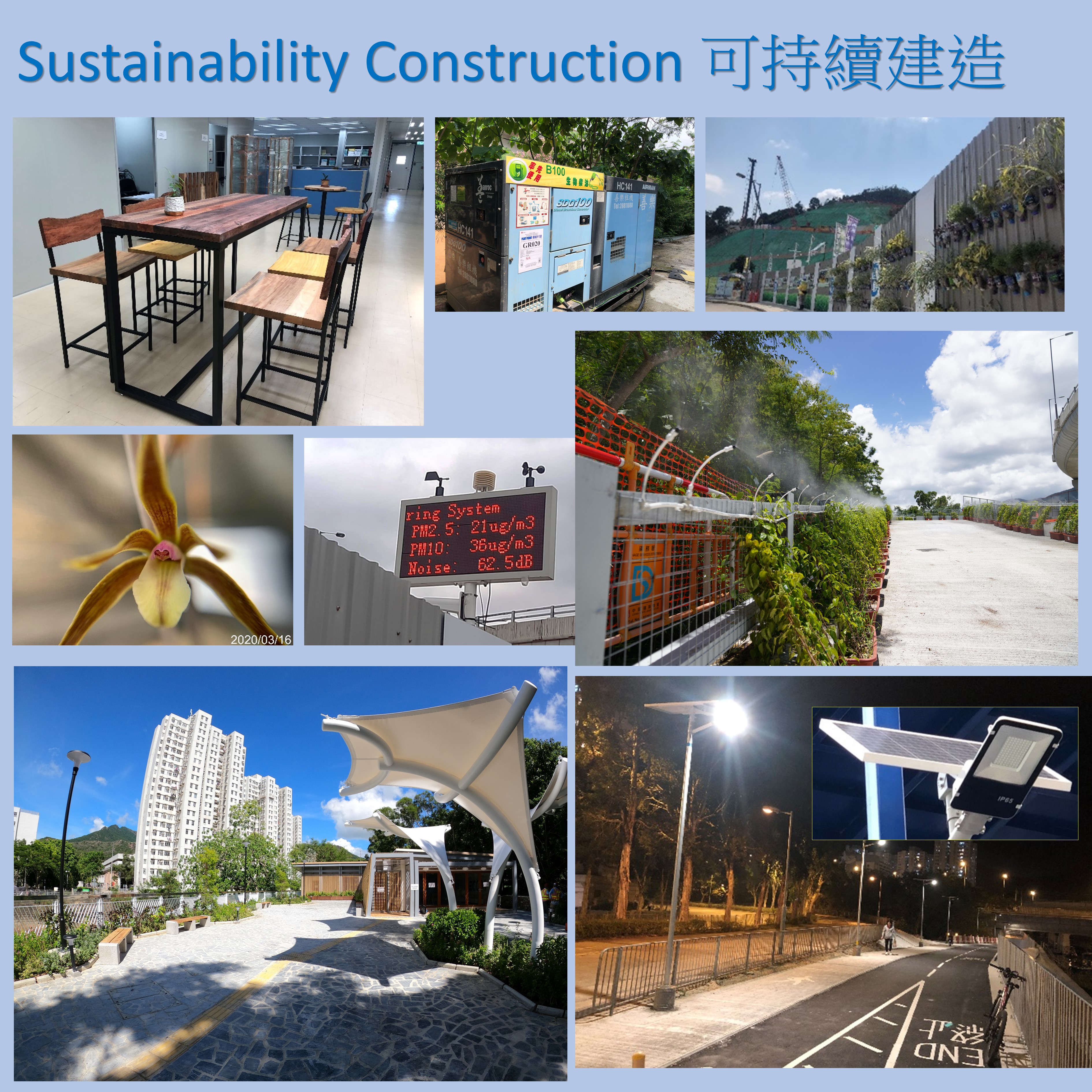 This project initiates various strategies of carbon emission reduction such as solar energy for street lights, reused waste wood as furniture, a rain garden at the Community Liaison Centre, protection of natural flora species, AI environmental monitoring and use of highest grade B100 biodiesel and waste reduction by the best use of material and establishment of alternative disposal grounds.