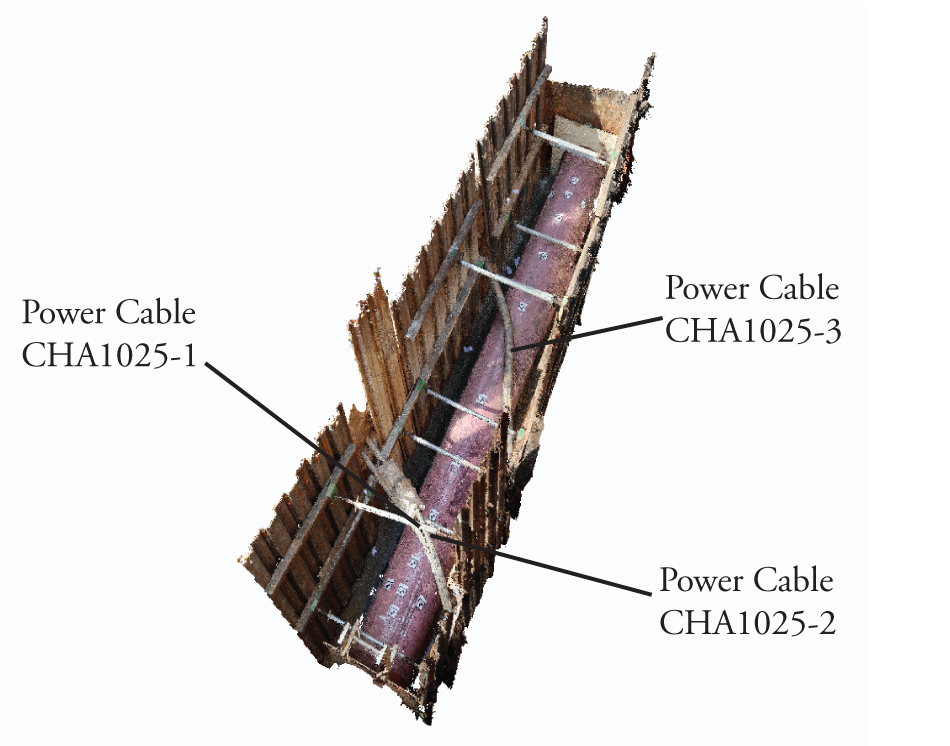 Application of point cloud survey can build up BIM models promptly, including as-built record of newly laid water mains and existing utilities in the pipe trench (such as power cables at various locations).