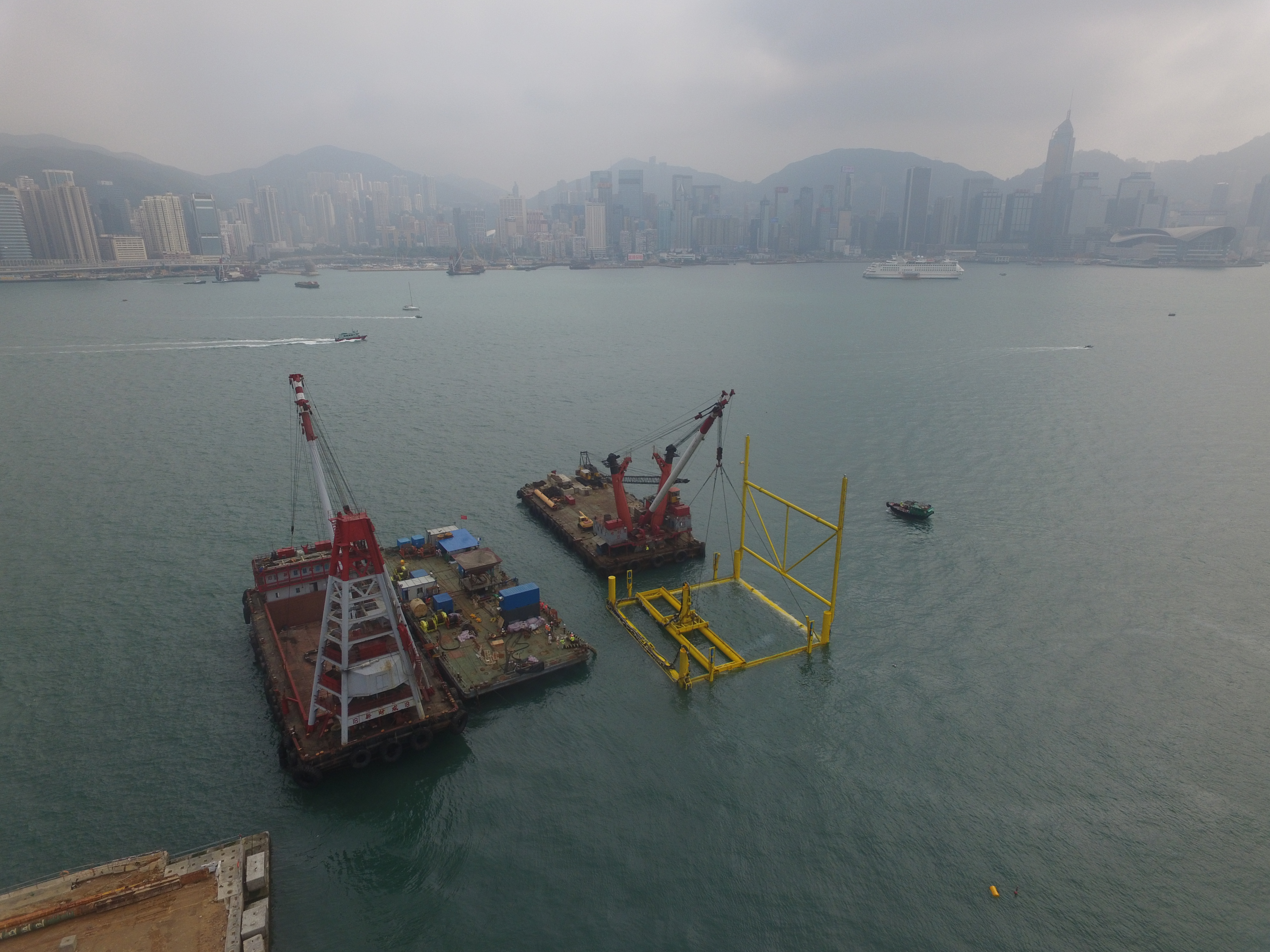 Towing the tunnel units from Shek O casting yard to Victoria Harbour is one of the most crucial works in the construction process. To ease this, steel bulkheads were installed at both ends of each tunnel segment such that it floated in the water. Tunnel units are then towed by tug boat to the designated location in Victoria Harbour for installation. This is an energy saving and environmentally friendly transportation method.